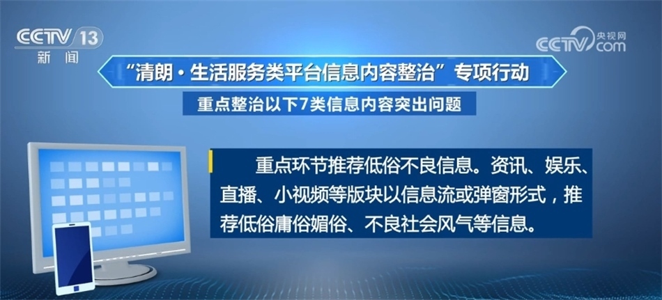重點環(huán)節(jié)推薦低俗不良信息。資訊、娛樂、直播、小視頻等版塊以信息流或彈窗形式,推薦低俗庸俗媚俗、不良社會風氣等信息?!?/p>
