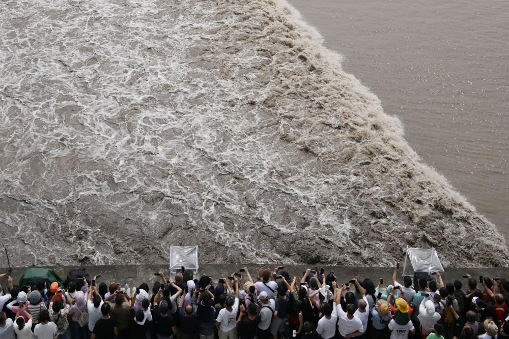 這是中秋當(dāng)日游客們在觀看錢塘江潮