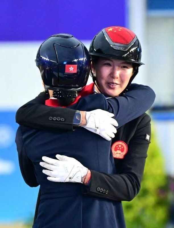 在桐廬馬術(shù)中心進(jìn)行的杭州亞運會馬術(shù)比賽盛裝舞步團(tuán)體賽頒獎儀式上,獲得亞軍的中國隊隊員饒嘉怡(右)與獲得季軍的中國香港隊隊員蕭穎瑩相互擁抱祝福(9月26日攝)