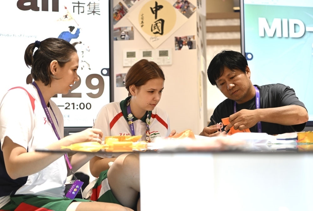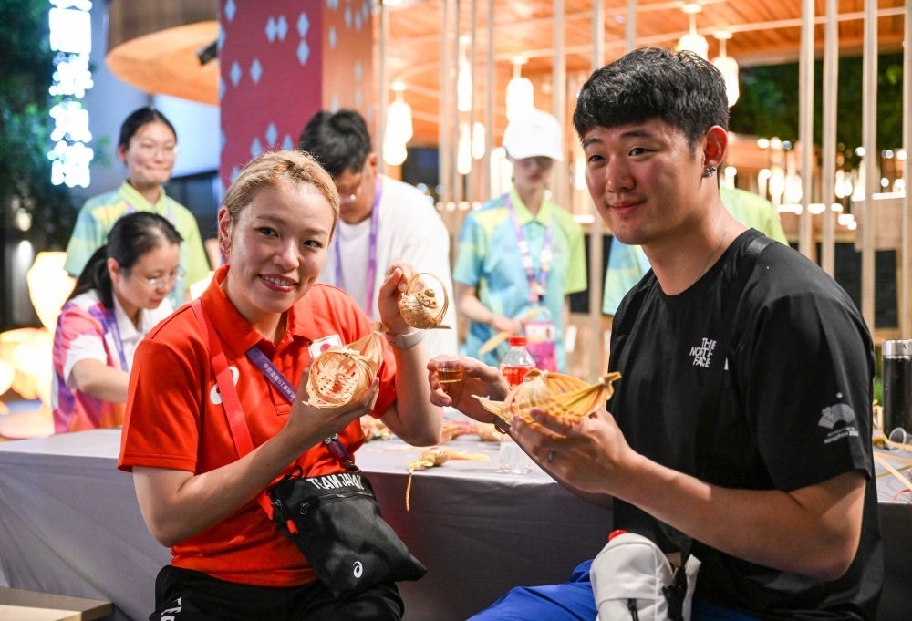 9月25日,一名日本運動員(右)在淳安賽區(qū)傳統(tǒng)工藝體驗坊和志愿者合影。
