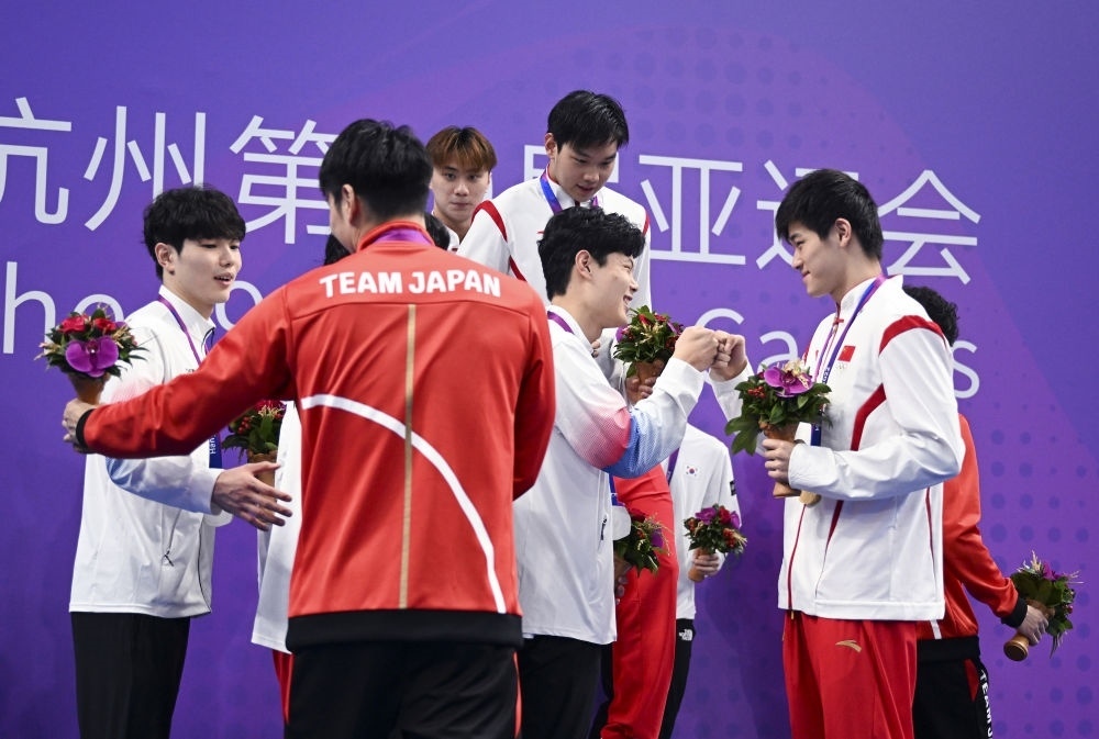 9月28日,中國隊選手在男子4X100米自由泳接力決賽后與韓國隊和日本隊選手致意。