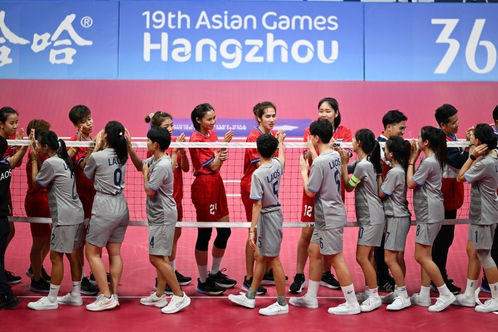 9月28日,泰國隊和老撾隊(前)在藤球女子單組團(tuán)體半決賽后互相致意。
