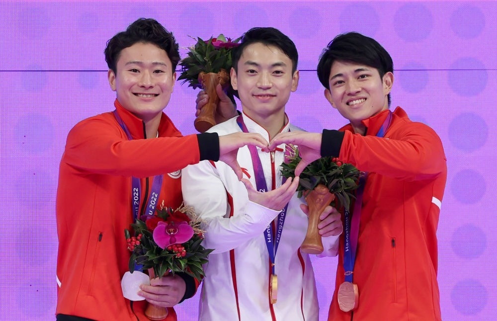 9月29日,亞軍日本選手北園丈琉、冠軍中國選手鄒敬園和季軍日本選手谷川翔(左至右)在體操男子雙杠頒獎儀式上。
