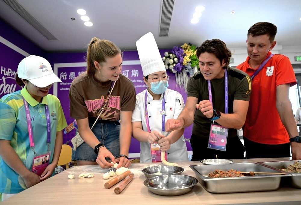 代表團(tuán)成員向中國廚師學(xué)習(xí)包餃子