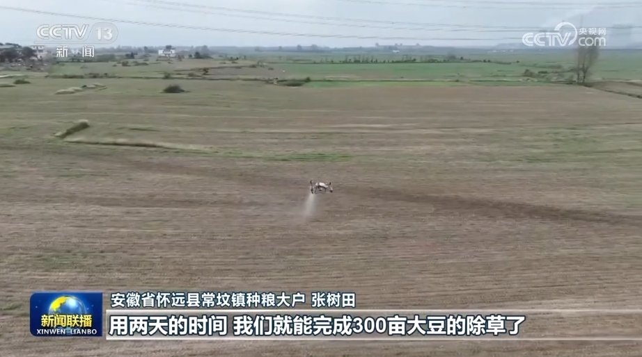 今年,皖北大豆主產(chǎn)區(qū)持續(xù)推進(jìn)單產(chǎn)提升行動。在安徽懷遠(yuǎn)縣種糧大戶張樹田的300畝大豆田里,無人機、植保機正在除草。由于夏播時全部采用大豆根瘤菌拌種,豆苗出得更齊、更壯。