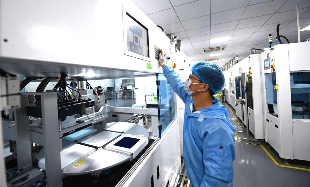在杭州市富陽區(qū)春江街道富春灣新城的杭州正銀電子材料有限公司的研發(fā)實驗室內,自動化設備在進行光伏板的絲網印刷(3月22日攝)。新華社記者 徐昱 攝