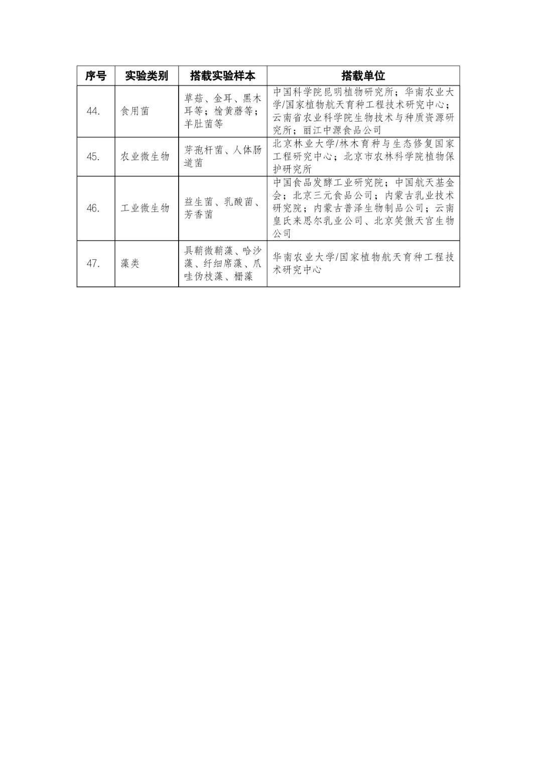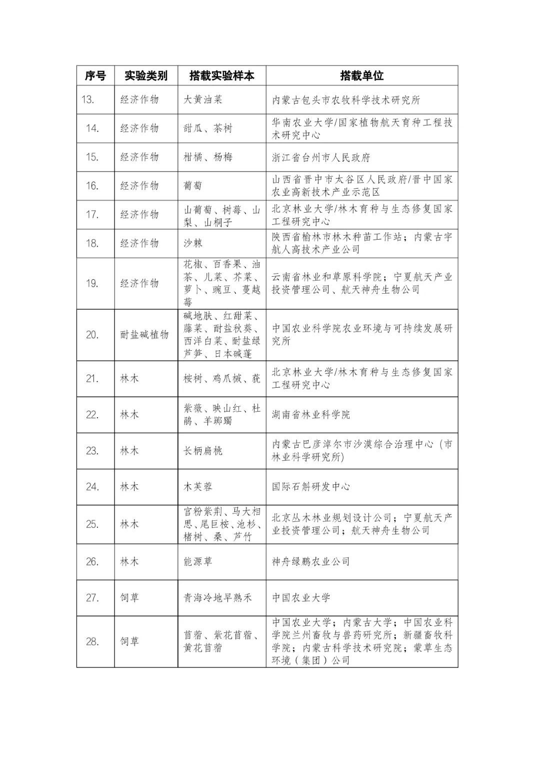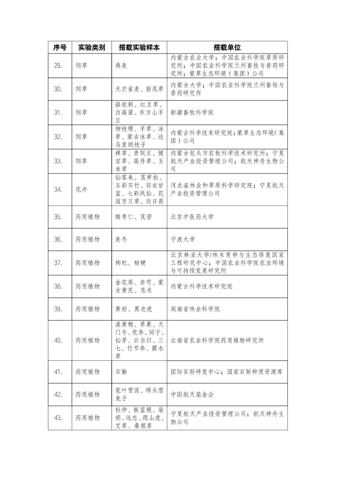 載人航天工程立項實施以來,始終注重提升工程綜合效益,致力服務(wù)國家經(jīng)濟社會發(fā)展。在工程歷次飛行任務(wù)中,均安排了航天育種搭載實驗項目。從神舟十六號載人飛船開始,中國載人航天工程辦公室向社會公開征集航天育種搭載實驗項目,于3月23日在工程官網(wǎng)發(fā)布《關(guān)于征集神舟系列載人飛船航天育種實驗項目的機會公告》,同時在工程官網(wǎng)開辟“航天育種搭載實驗”管理平臺,接受搭載需求單位申報實驗項目。辦公室組織專家對申報項目進(jìn)行評審,遴選出53個單位的136種份航天育種實驗材料實施搭載。包括農(nóng)作物47份(糧食作物種子12份、經(jīng)濟作物種子28份、耐鹽堿植物7份);林草、花卉和藥用植物76份(林木17份、飼草21份、花卉7份、藥用植物31份);微生物和其它13種(農(nóng)業(yè)微生物菌種2種、工業(yè)微生物菌種3種、食用菌3種、藻類和苔蘚5種)(清單附后)。
