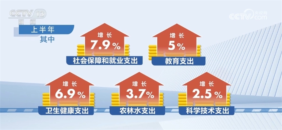 從支出看,上半年,全國一般公共預(yù)算支出133893億元,同比增長3.9%。其中,社會保障和就業(yè)支出增長7.9%,教育支出增長5%,衛(wèi)生健康支出增長6.9%,農(nóng)林水支出增長3.7%,科學(xué)技術(shù)支出增長2.5%,基本民生、鄉(xiāng)村振興、區(qū)域重大戰(zhàn)略、教育、科技攻關(guān)等重點(diǎn)支出得到有力保障。