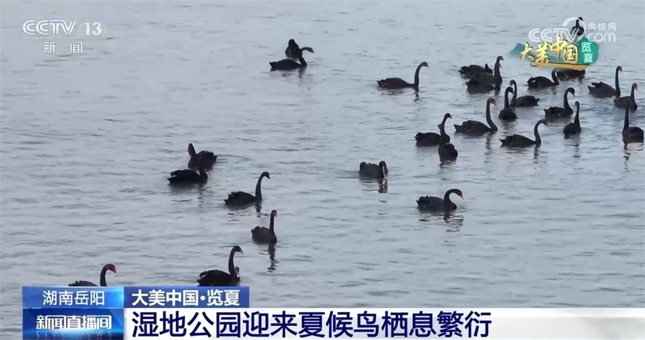 時值盛夏,湖南岳陽湘陰的洋沙湖-東湖國家濕地公園引來大批夏候鳥來此棲息繁衍。碧波蕩漾、清荷搖曳,黑天鵝在此嬉戲覓食,麋鹿閑庭信步、悠然自得。