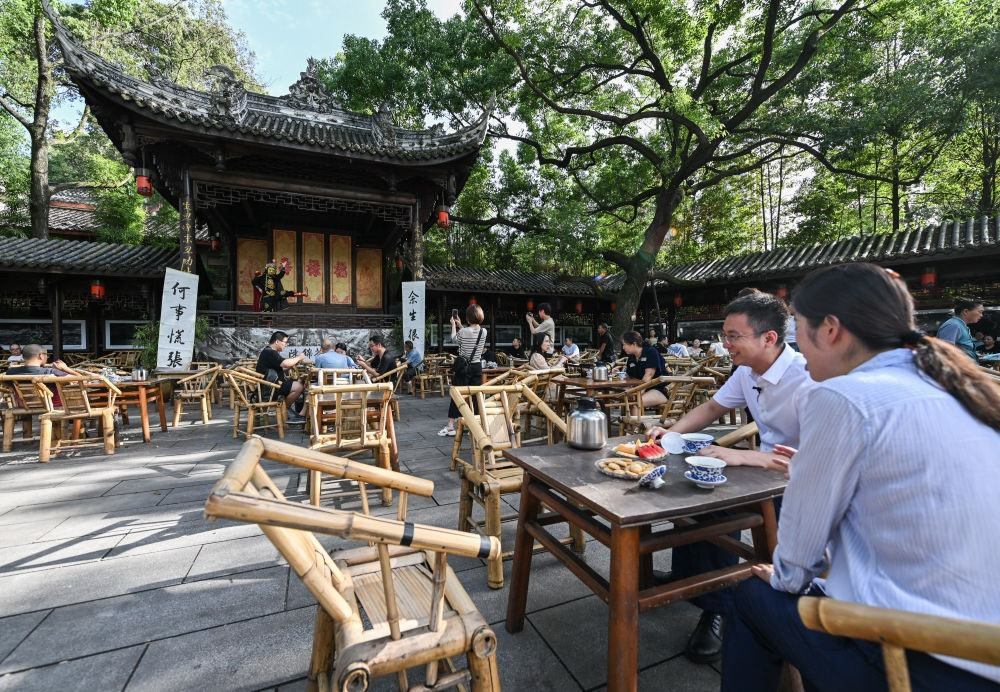 7月14日,在成都高新區(qū)鐵像寺水街,游客在茶鋪體驗(yàn)當(dāng)?shù)靥厣w碗茶。新華社記者 王曦 攝