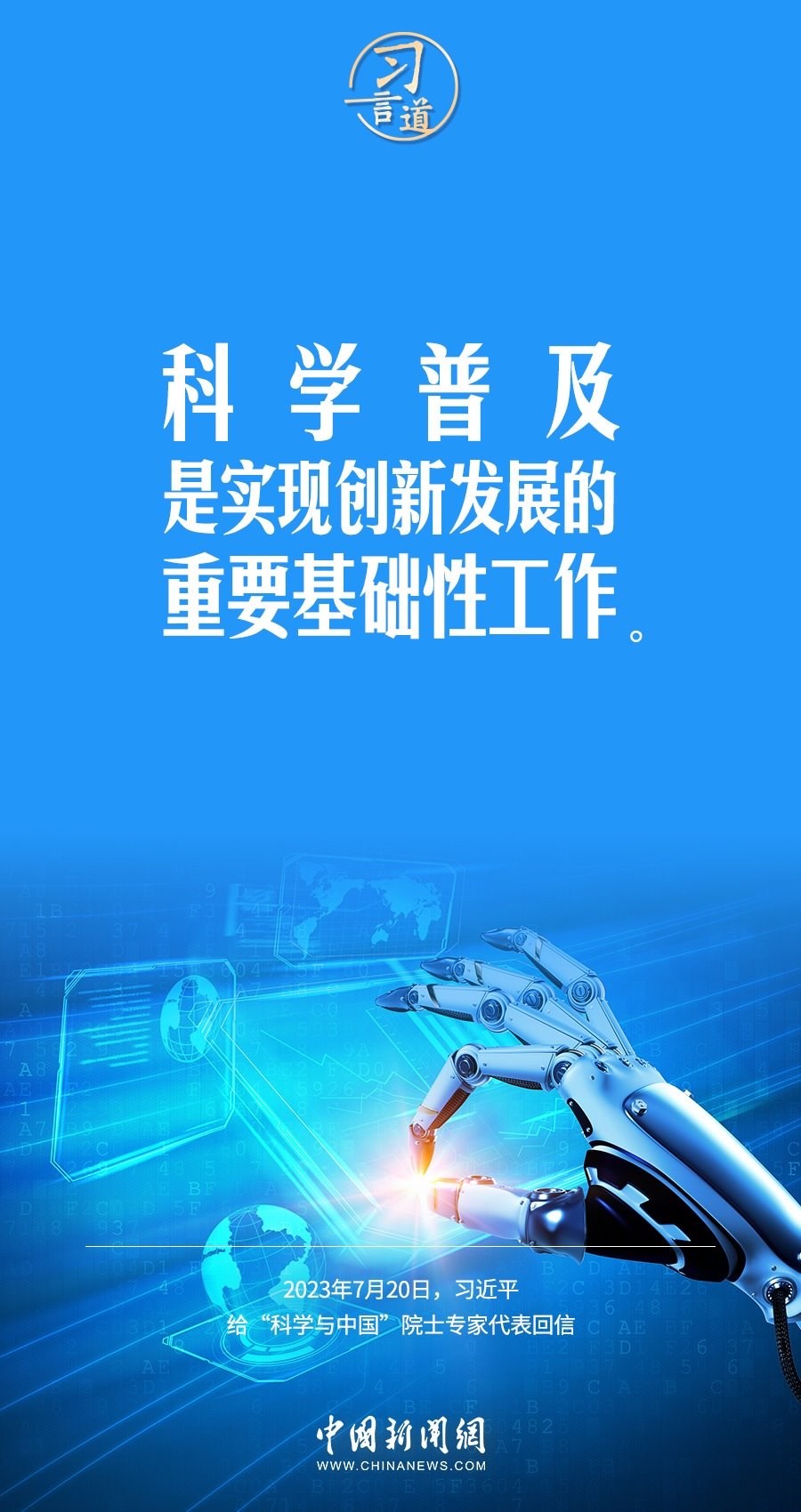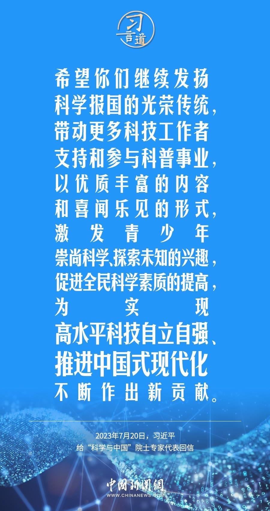 中共中央總書記、國家主席、中央軍委主席習(xí)近平7月20日給“科學(xué)與中國”院士專家代表回信,對(duì)科技工作者支持和參與科普事業(yè)提出殷切期望。他指出——
