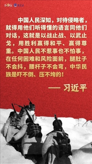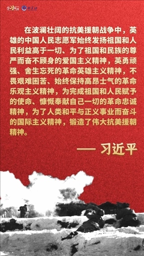 偉大抗美援朝精神跨越時(shí)空、歷久彌新。我們要銘記抗美援朝戰(zhàn)爭(zhēng)的艱辛歷程和偉大勝利,敢于斗爭(zhēng)、善于斗爭(zhēng),知難而進(jìn)、堅(jiān)韌向前,把新時(shí)代中國特色社會(huì)主義偉大事業(yè)不斷推向前進(jìn)。