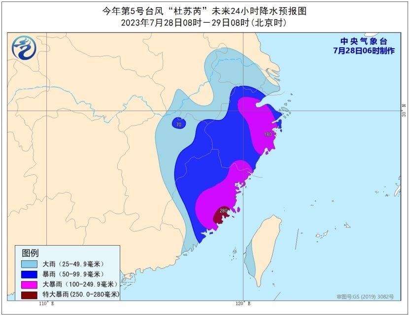 降水預(yù)報:28日08時至29日08時,江蘇南部、安徽南部、浙江、福建、江西東部、臺灣島西南部等地的部分地區(qū)有大到暴雨,其中,浙江北部和東部、福建東部等地的部分地區(qū)有大暴雨,局地特大暴雨(250-280毫米)。