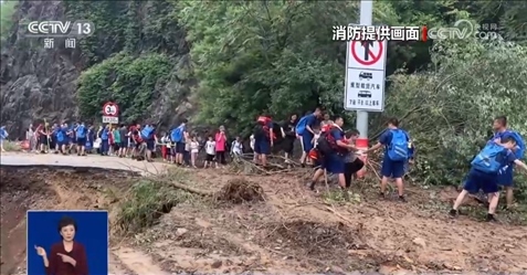 8月2日上午,現(xiàn)場總指揮決定護送自愿離開的被困群眾進行撤離。在撤離的隊伍中,有38名來自新疆參加北京游學的孩子,他們最小的6歲,平均年齡也只有8歲。為了保障轉(zhuǎn)移時的安全,撤離線路選擇了相對安全的盤山公路進行。途中經(jīng)過落石塌方險區(qū)的時候,消防員們依次排開,在斷崖旁形成人墻,用身體筑起一條防線。遇到水流,消防員們把孩子們抱著傳遞到安全位置再繼續(xù)前行。