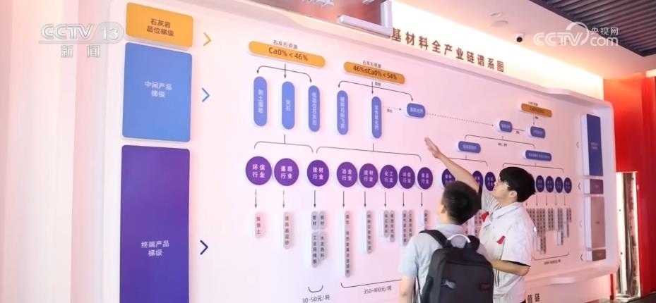 在企業(yè)展廳里,工作人員把記者引向一張產(chǎn)業(yè)鏈譜系圖。最基礎(chǔ)的石灰石,既可以是水泥的生產(chǎn)原料,還可以根據(jù)石頭的鈣含量和加工深度,延伸出氧化鈣、碳酸鈣、納米鈣等各種各樣的下游產(chǎn)品,用于食品、醫(yī)藥、電子等領(lǐng)域。產(chǎn)品鏈條每往下延伸一步,價(jià)格就要翻上幾倍。