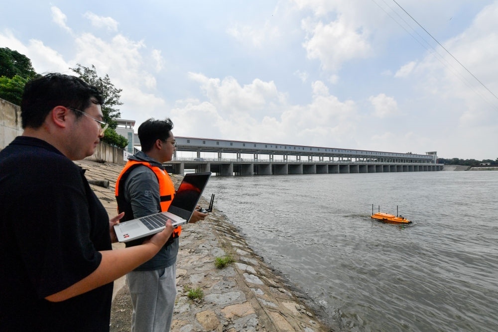 8月2日,在天津市獨(dú)流減河進(jìn)洪閘上游,水文人員操作無(wú)人水文監(jiān)測(cè)船進(jìn)行水文監(jiān)測(cè)。新華每日電訊記者孫凡越攝