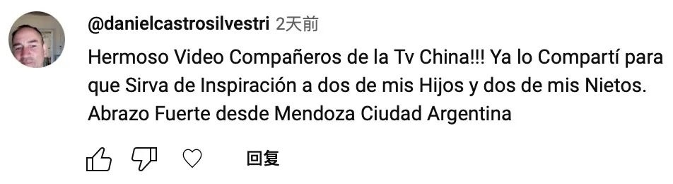 網(wǎng)友danielcastrosilvestri:“中國電視臺的朋友們,這個視頻太好看了?。?!我把它分享出去,希望它能夠給我的兩個孩子和兩個孫子帶來啟發(fā)。我來自阿根廷的門多薩市,致禮?!?/p>
