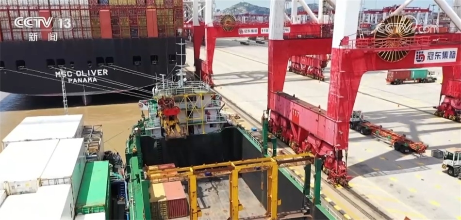 在洋山港三期冠東碼頭,兩艘大型遠(yuǎn)洋集裝箱船中間的這艘小船是來(lái)自江蘇太倉(cāng)港的快航班輪,它剛剛完成200多個(gè)集裝箱裝卸。通過(guò)水路完成“水水中轉(zhuǎn)”,將這些集裝箱裝上遠(yuǎn)洋貨輪出口海外,無(wú)需轉(zhuǎn)關(guān)申報(bào)或倉(cāng)儲(chǔ)停留,實(shí)現(xiàn)了聯(lián)動(dòng)接卸。