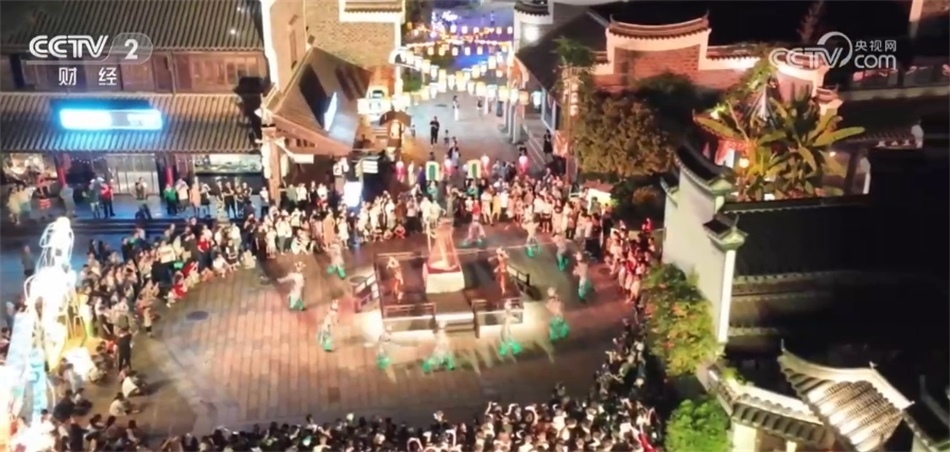 總臺記者 姜文婧:大家看我的身邊現(xiàn)在已經(jīng)聚集了很多人,行進式的情景演出《無夢到銅官》已經(jīng)開始了。整場演出都在移步換景中完成,依托古鎮(zhèn)建筑群、街道和各個打卡裝置,營造出漢唐風(fēng)的市井繁華景象,讓游客身臨其境,還可以與演員互動。