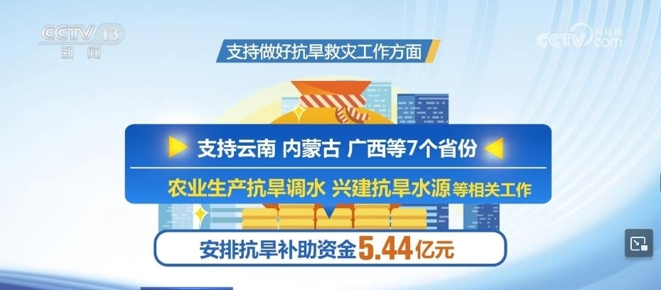 在支持做好抗旱救災工作方面,安排抗旱補助資金5.44億元,支持云南、內(nèi)蒙古、廣西等7個省份,開展農(nóng)業(yè)生產(chǎn)抗旱調(diào)水、興建抗旱水源等相關工作。 ?