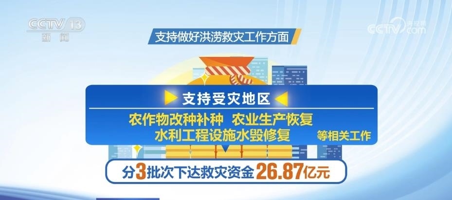 在支持做好洪澇救災工作方面,分3批次下達救災資金26.87億元,支持受災地區(qū)開展農(nóng)作物改種補種、農(nóng)業(yè)生產(chǎn)恢復、水利工程設施水毀修復等相關工作。