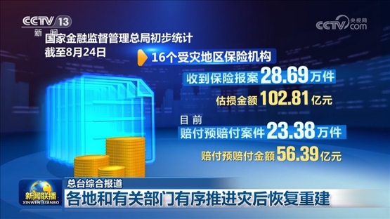國(guó)家金融監(jiān)督管理總局初步統(tǒng)計(jì),截至8月24日,16個(gè)受災(zāi)地區(qū)保險(xiǎn)機(jī)構(gòu)收到保險(xiǎn)報(bào)案28.69萬件,估損金額102.81億元。目前賠付預(yù)賠付案件23.38萬件,賠付預(yù)賠付金額56.39億元。