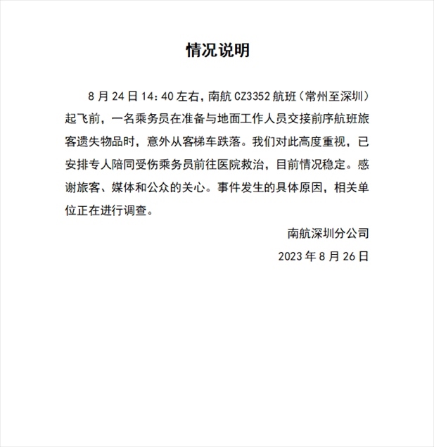 ·南航回應“空乘跌落”:傷者情況穩(wěn)定,具體原因正在調查。