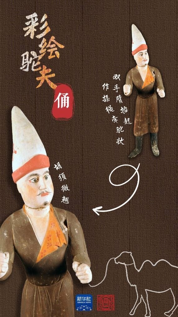 吐魯番阿斯塔那206號墓是唐代高昌左衛(wèi)大將軍張雄與妻子的合葬墓。墓中出土的木俑做工精湛,大多是由中原生產(chǎn),具有明顯的盛唐風(fēng)格,彩繪駝夫俑便出土于此。駝夫?yàn)楹四凶有蜗?,深目高鼻,胡須微翹,頭戴高聳折沿白氈尖帽,身著褐色掩襟長袍,足穿高棱黑靴。此俑為分段雕刻膠合而成,再施以彩繪,面部表情富有神韻,惟妙惟肖。通過駝夫生動(dòng)的神情仿佛看到他牽著駱駝,帶著各色商品,沿著絲綢之路慢慢走來。