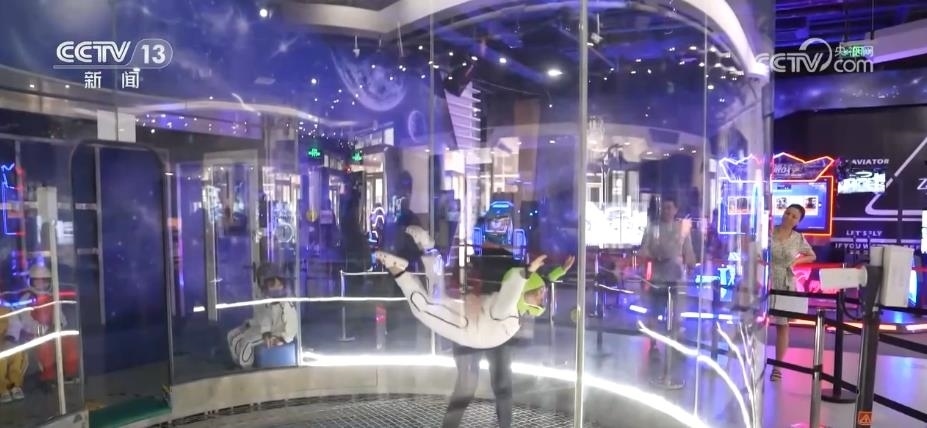 腹部朝下、身體張開、雙腿繃直,在完成這樣一個(gè)標(biāo)準(zhǔn)的飛行動(dòng)作后,就可以在這個(gè)空洞中平穩(wěn)飛升到10多米高的空中,模擬體驗(yàn)跳傘的感覺。