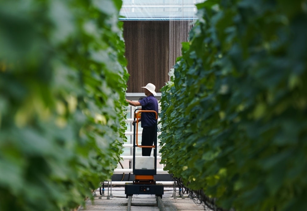 2023年7月26日,在山東濰坊壽光市丹河設(shè)施蔬菜標(biāo)準(zhǔn)化生產(chǎn)示范園,農(nóng)民在管護(hù)作物。新華社記者 張浩波 攝