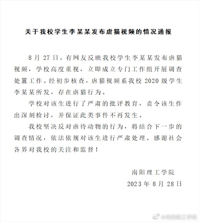 ·南陽理工學(xué)院通報“學(xué)生發(fā)布虐貓視頻”:責(zé)令其作出深刻檢討,將進行嚴肅處理。