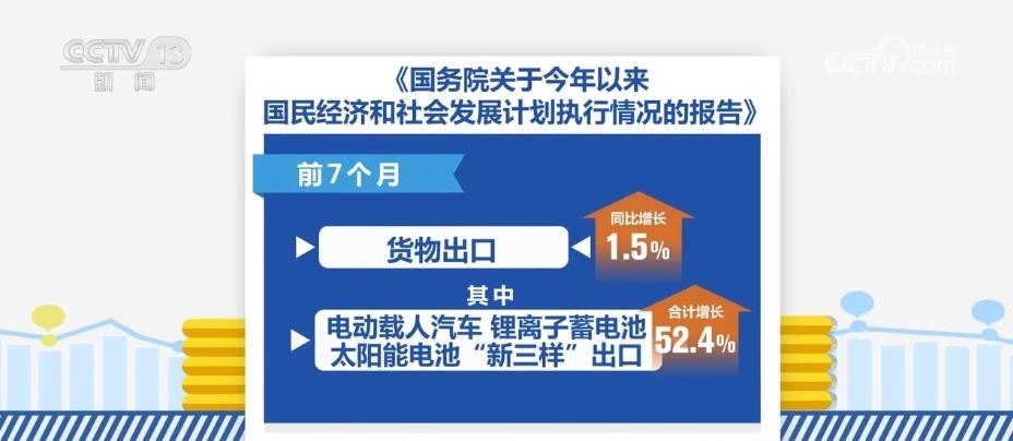 前7個月,貨物出口同比增長1.5%,其中,電動載人汽車、鋰離子蓄電池、太陽能電池“新三樣”出口合計增長52.4%。