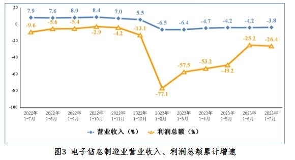 1—7月份,規(guī)模以上電子信息制造業(yè)實(shí)現(xiàn)營業(yè)收入7.98萬億元,同比下降3.8%,較上半年降幅收窄0.4個百分點(diǎn);營業(yè)成本6.98萬億元,同比下降3.3%;實(shí)現(xiàn)利潤總額2763億元,同比下降26.4%,較上半年降幅加深1.2個百分點(diǎn);營業(yè)收入利潤率為3.5%,較上半年下降0.1個百分點(diǎn)。