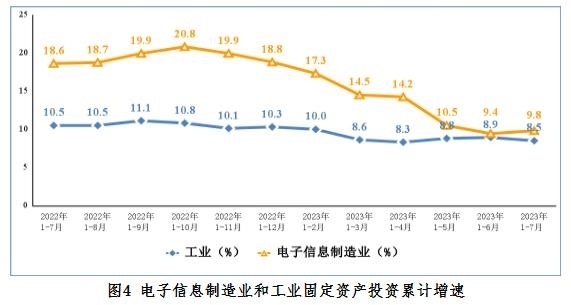 1—7月份,電子信息制造業(yè)固定資產(chǎn)投資同比增長9.8%,比同期工業(yè)投資增速高1.3個百分點(diǎn),但比高技術(shù)制造業(yè)投資增速低1.7個百分點(diǎn)。