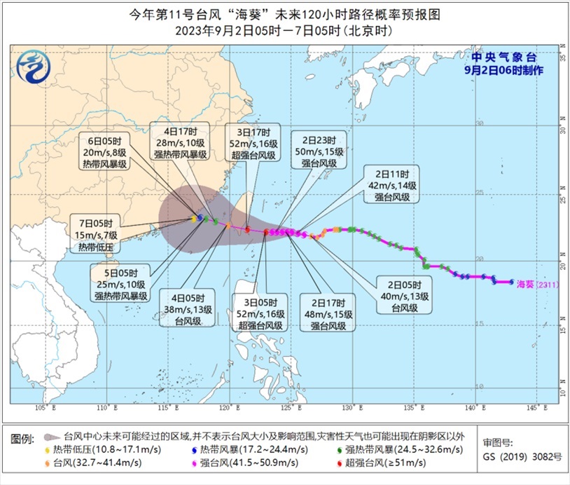 大風(fēng)預(yù)報(bào):9月2日08時(shí)至3日08時(shí),受“蘇拉”影響,南海西北部、北部灣東部、瓊州海峽及廣東沿海、廣西南部沿海、珠江口以及香港和澳門等地將有7-9級(jí)、陣風(fēng)10-11級(jí)的大風(fēng),“蘇拉”中心經(jīng)過的附近海面或地區(qū)風(fēng)力有12-13級(jí)、陣風(fēng)14-15級(jí);受“??庇绊?,臺(tái)灣海峽、浙江南部沿海、福建沿海、廣東東部沿海、臺(tái)灣島沿海將有6-7級(jí),陣風(fēng)8級(jí)大風(fēng),臺(tái)灣以東洋面部分海域風(fēng)力可達(dá)8-10級(jí),陣風(fēng)11-12級(jí),“海葵”中心經(jīng)過的附近海面風(fēng)力可達(dá)12-13級(jí),陣風(fēng)14級(jí)。