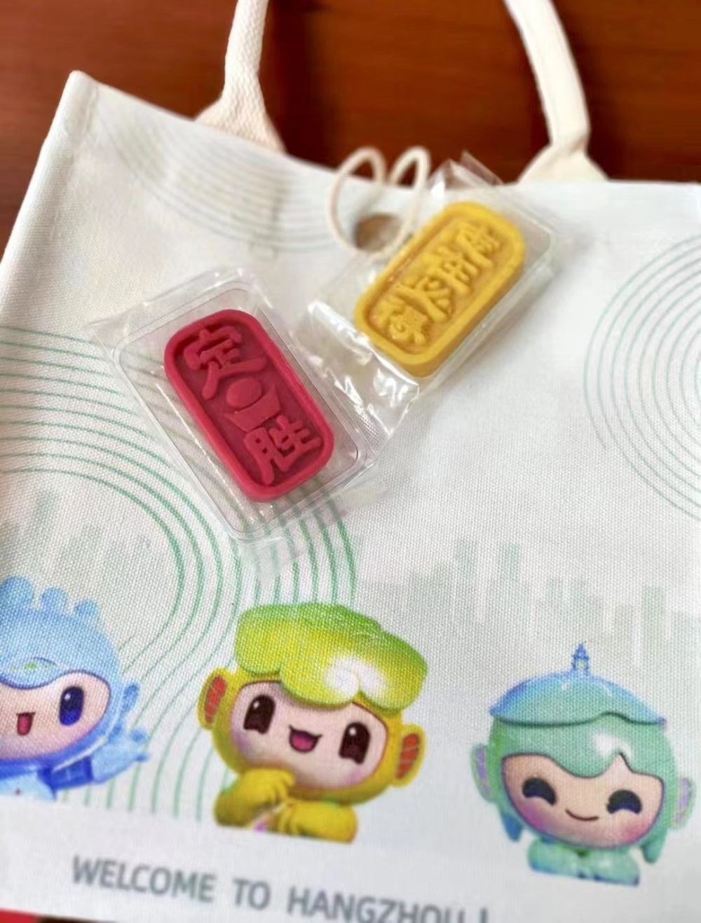 “志愿者們可以在手賬本上記錄志愿服務(wù)過程中的點點滴滴,留下美好的亞運回憶;特制的行李卡牌可以幫助他們標(biāo)記自己的物品和行李;而一紅一黃兩塊定勝糕上面分別寫有‘定勝’以及‘志在必得’的字樣,則是為他們加油打氣?!焙贾輥嗊\村人事與志愿者管理中心副主任、浙江外國語學(xué)院團(tuán)委書記邱萍說。