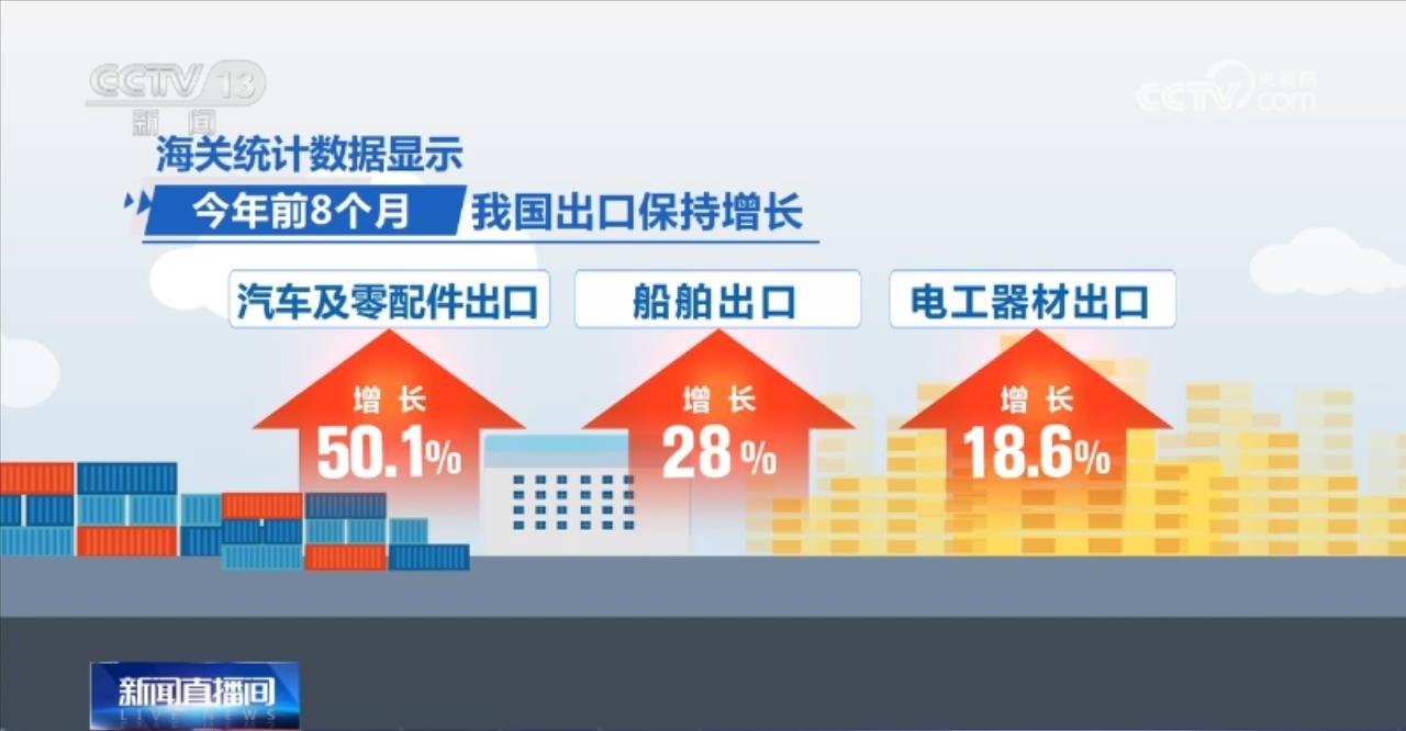 今年前8個月,我國出口保持增長。其中,機(jī)電產(chǎn)品出口8.97萬億元,同比增長3.6%,占同期我國出口總值的58%;汽車及零配件出口、船舶出口、電工器材出口分別增長50.1%、28%、18.6%。