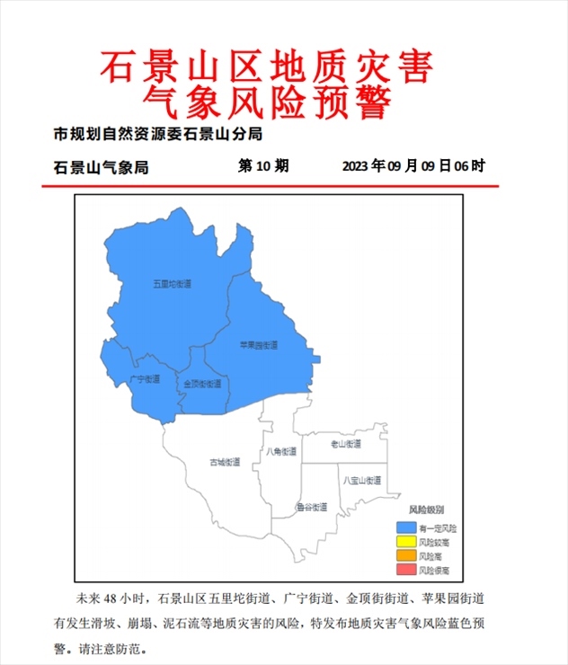 石景山區(qū)五里坨街道、廣寧街道、金頂街街道、蘋果園街道有發(fā)生滑坡、崩塌、泥石流等地質(zhì)災(zāi)害的風(fēng)險(xiǎn),特發(fā)布地質(zhì)災(zāi)害氣象風(fēng)險(xiǎn)藍(lán)色預(yù)警。請(qǐng)注意防范。