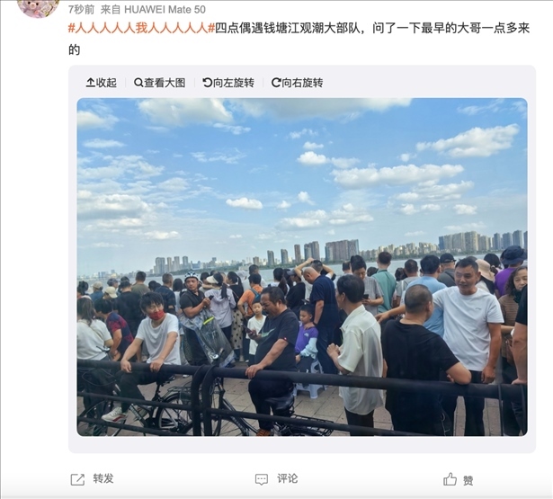 前往浙江錢塘江觀潮的網(wǎng)友發(fā)布消息稱:“四點(diǎn)偶遇錢塘江觀潮大部隊(duì),問了一下最早的大哥一點(diǎn)多來的”。