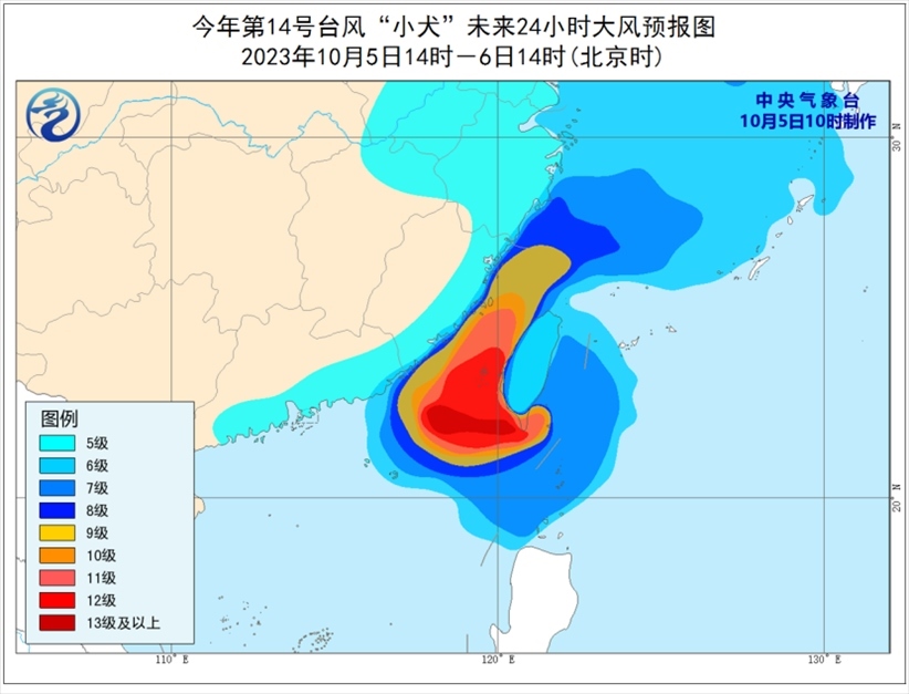 大風(fēng)預(yù)報:5日14時至6日14時,東海大部及釣魚島附近海域、臺灣以東洋面、巴士海峽、臺灣海峽、南海東北部以及浙江沿海、福建沿海、廣東東部沿海、臺灣島沿海將有6-8級、陣風(fēng)9-10級的大風(fēng),其中巴士海峽北部海面、臺灣海峽、臺灣島南部及沿海風(fēng)力將有9-12級、陣風(fēng)12-13級,“小犬”中心經(jīng)過的附近海面風(fēng)力可達13-14級,陣風(fēng)15-16級。