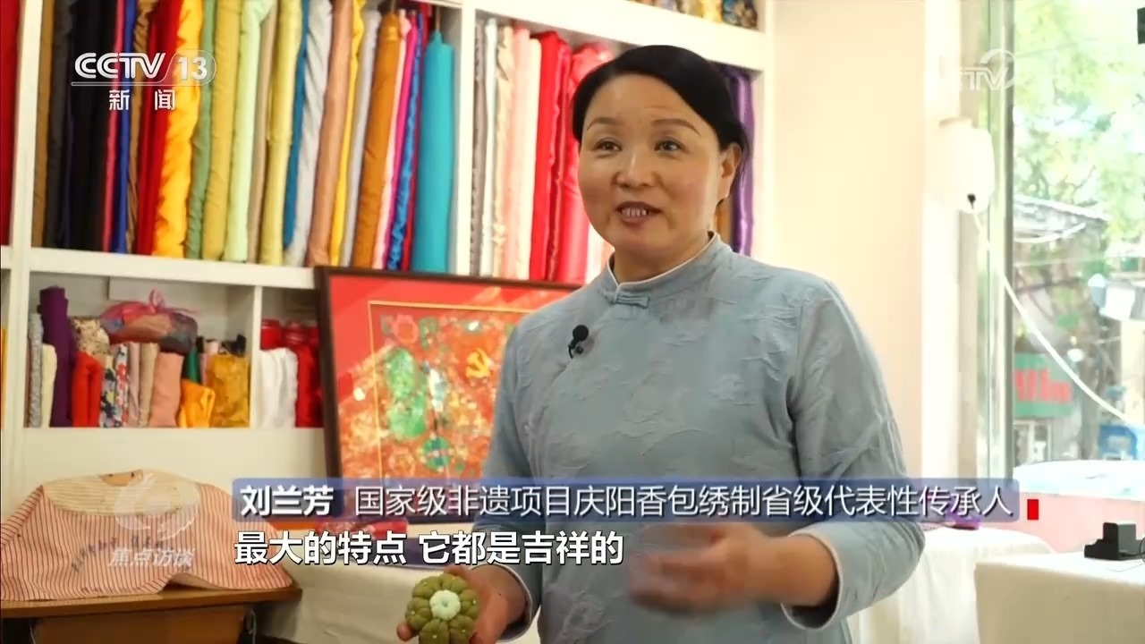 國(guó)家級(jí)非遺項(xiàng)目慶陽(yáng)香包繡制省級(jí)代表性傳承人劉蘭芳:“這個(gè)針法的特點(diǎn)是一根針一根線從頭到尾不能斷頭,要一次完成,而且左右對(duì)稱、上下對(duì)稱,我們祖祖輩輩傳承到今天?!?/p>
