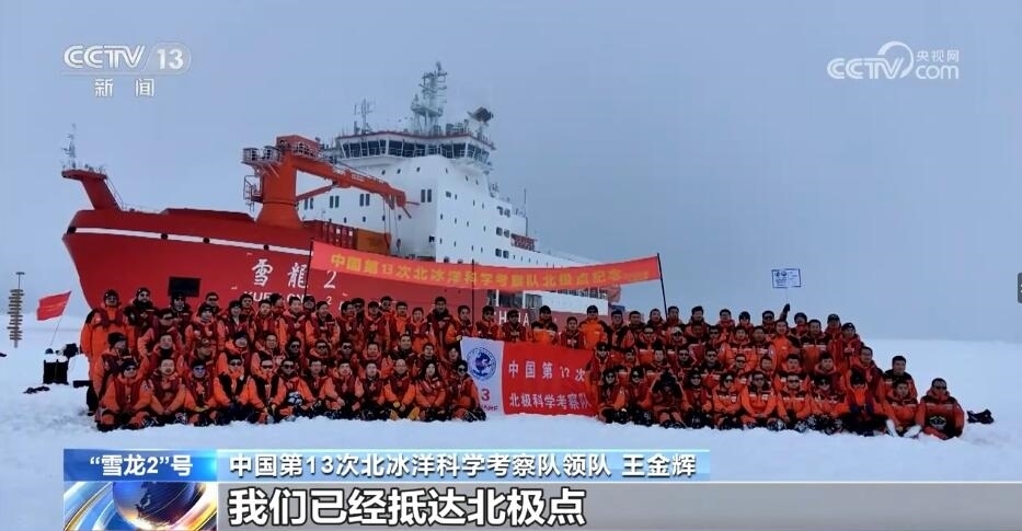 中國第13次北冰洋科學考察隊領隊 王金輝:中國第13次北冰洋科學考察隊隊員們,很高興地告訴大家,我們已經(jīng)抵達北極點。