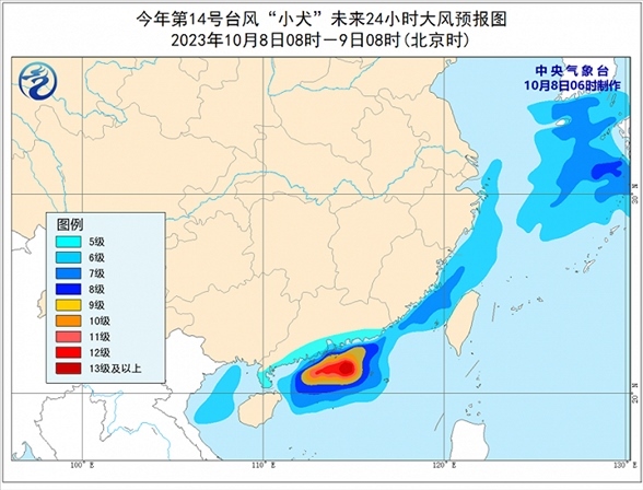 昨日,“小犬”給浙江東部、福建南部、廣東東部等地帶來明顯風雨,廣東揭陽、汕頭局地大暴雨。預(yù)計未來24小時,受冷空氣和“小犬”共同影響,臺灣島東北部、廣東中部沿海、珠江口附近將有大到暴雨、局地大暴雨(100-150毫米);東海大部、臺灣海峽、南海北部、北部灣以及浙江沿海、福建沿海、廣東沿海將有6-8級、陣風9-10級的大風,其中廣東沿海、南海北部的部分海域?qū)⒂?-11級、陣風12-13級的大風,“小犬”中心經(jīng)過的附近海面風力有12-14級,陣風15-16級。