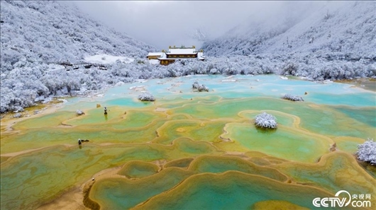 四川阿壩,黃龍景區(qū)迎來降雪,白雪與池水相映,宛如童話世界。