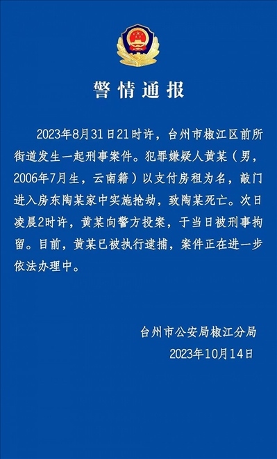 ·浙江臺州警方通報(bào)17歲少年殺害65歲房東:已逮捕。