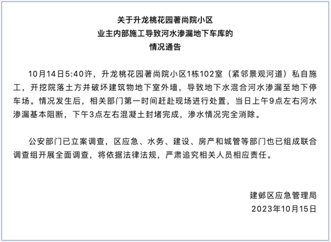 ·網(wǎng)傳南京一業(yè)主濫挖地下室致河水倒灌車庫,官方通報:多部門調(diào)查追責。