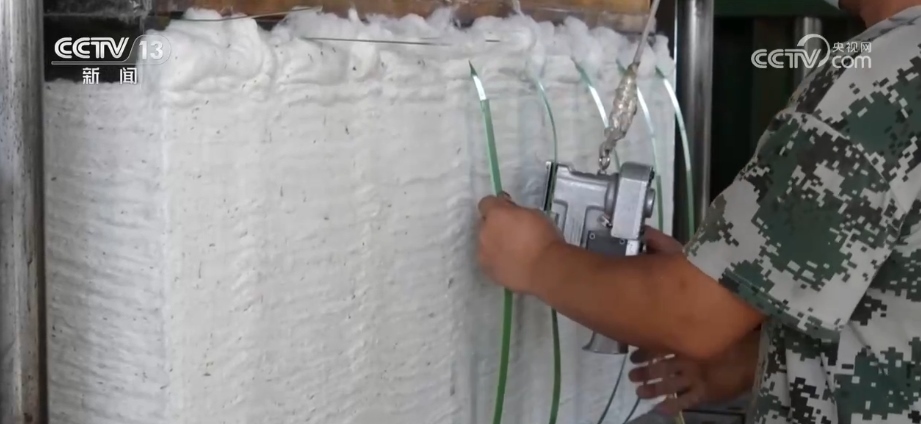 在當地的棉花加工廠車間內機器轟鳴,工人們有序地將剛收回來的棉花裝卸、碼垛。