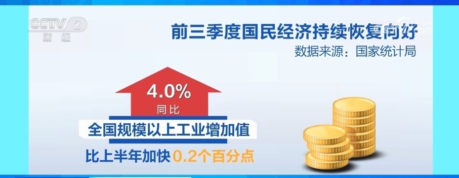 工業(yè)生產(chǎn)恢復(fù)加快,裝備制造業(yè)較快增長。前三季度,全國規(guī)模以上工業(yè)增加值同比增長4.0%,比上半年加快0.2個百分點(diǎn)。