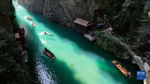 秋日,湖北省恩施土家族苗族自治州鶴峰縣容美鎮(zhèn)屏山村屏山旅游景區(qū)吸引眾多游客。屏山旅游景區(qū)河水清澈見(jiàn)底,舟行水上如懸浮空中,美如畫(huà)卷。