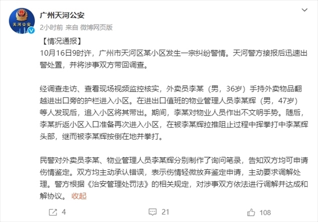 ·廣州警方通報(bào)小區(qū)保安將外賣(mài)員按地上毆打:雙方均主動(dòng)承認(rèn)錯(cuò)誤,已達(dá)成和解協(xié)議。